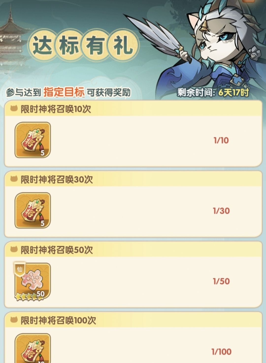如图,限时神将召唤达标30次送10个券,40保底必拿一个本体,再算上七天每日免费一次,相当于23券拿一个本体,这是相当合适的,强烈建议在囤货期间又不影响280抽的前提下果断入手每一期的限时神将一个本体。#游戏攻略 # #猫三国新手养成攻略手册