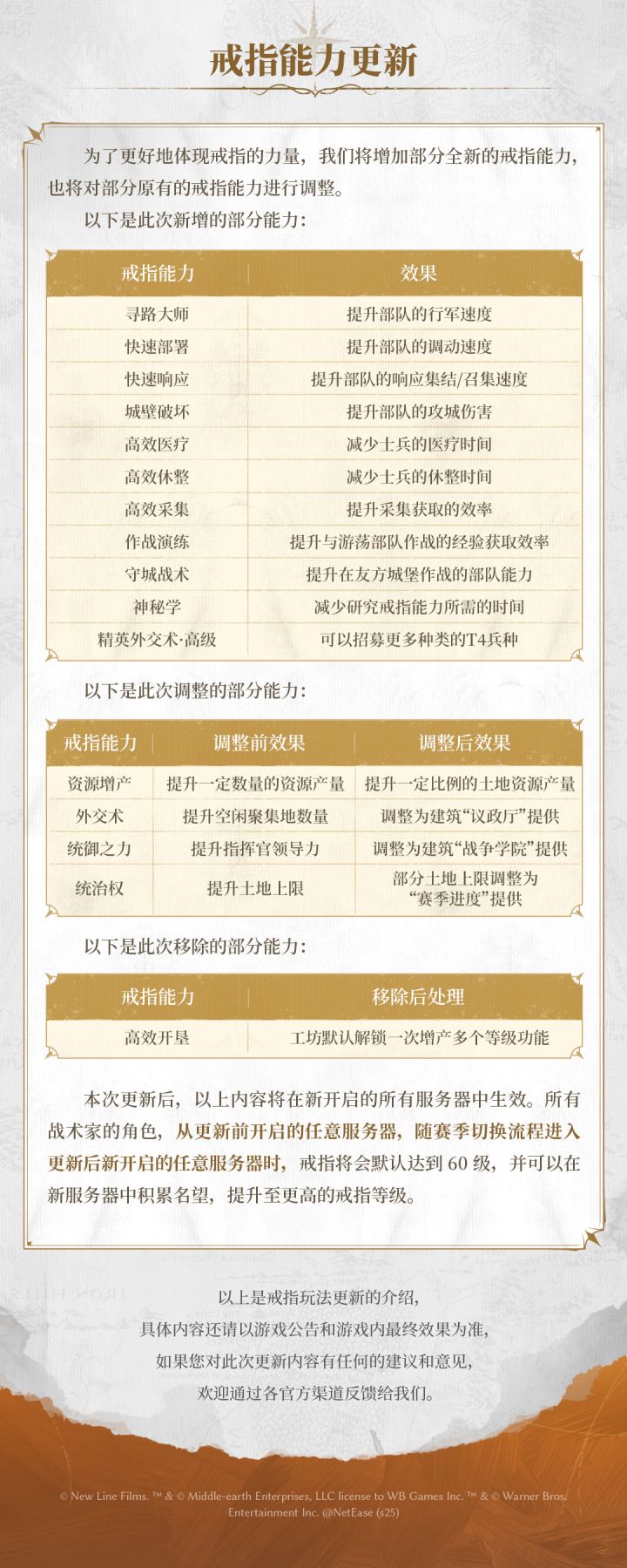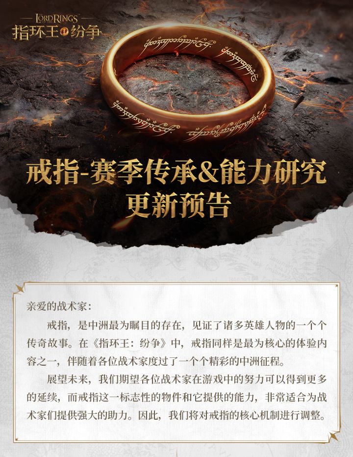 亲爱的战术家: 戒指,是中洲最为瞩目的存在,见证了诸多英雄人物的一个个传奇故事。在《指环王:纷争》中,戒指同样是最为核心的体验内容之一,伴随着各位战术家度过了一个个精彩的中洲征程。 展望未来,我们期望各位战术家在游戏中的努力可以得到更多的延续,而戒指这一标志性的物件和它提供的能力,非常适合为战术家们提供强大的助力。因此,我们将对戒指的核心机制进行调整。