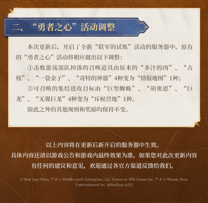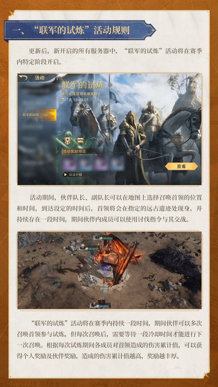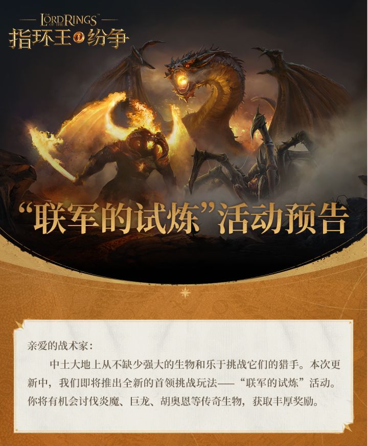亲爱的战术家,中土大地上从不缺少强大的生物和乐于挑战它们的猎手。本次更新中,我们即将推出全新的首领挑战玩法——“联军的试炼”活动。你将有机会讨伐炎魔、巨龙、胡奥恩等传奇生物,获取丰厚奖励!