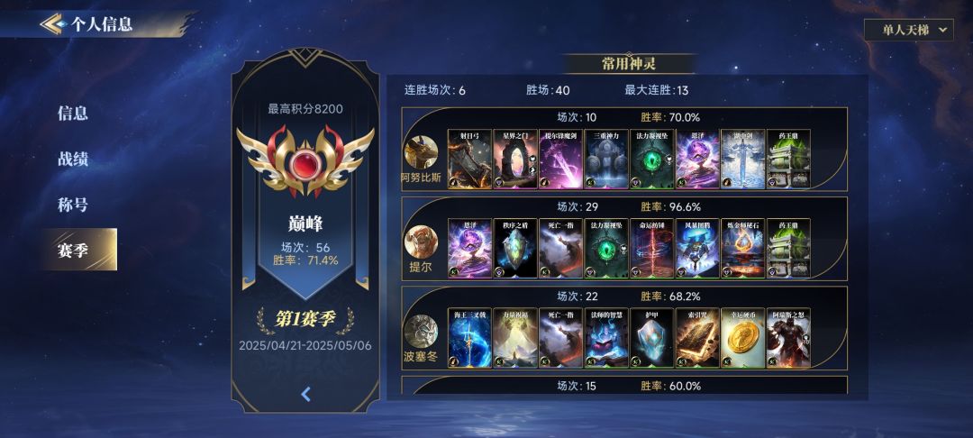 进游戏先过新手,快进到排位,双人比单人好打,双人英雄不容易被禁,双人排位上分特别快,虽然玩的盘数差不大,但是双人体验真的舒服,经常能拿到想要的神灵,我玩第一天就上到了这个段位,后面一局都没打过了(双人好像匹配到的都是人机),单人神灵老是被禁,对英雄池少的不友好。 砖石抽冒险的英灵或者抽构造卡,神灵其实几只就够玩了,感觉还没有形成成熟的策略,能拿提尔就基本上能赢,其他神灵(海姆达尔,阿努比斯,波塞冬