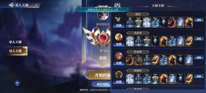 0氪两天巅峰双人模式,起号永夜活动3次十连抽海拉,金卡就合了张闪电风暴,偏速度流卡组,没有力量卡,防具卡也只有影步长袍能用,核心思路就是上智者之石,之后就上能使用的构筑卡快速叠属性,属性够洛基降临和潜影蛇手就可以打控场了。不能叠属性的时候建议是把构筑牌留手里,经常一波爆发打崩对面。 主要上分就是海拉了,你队友不玩那种抽象的肉盾英雄很好赢,洛基运气好可以开局扒光两个人,哈迪斯是必禁的,构筑齐全一波