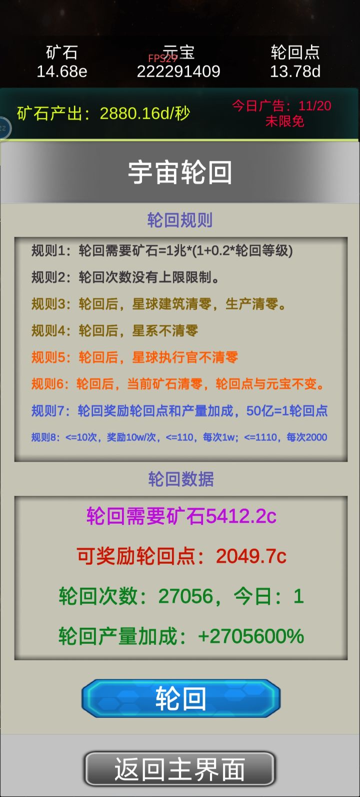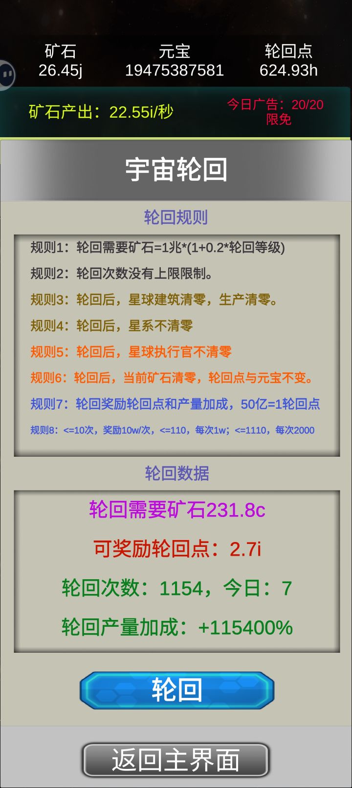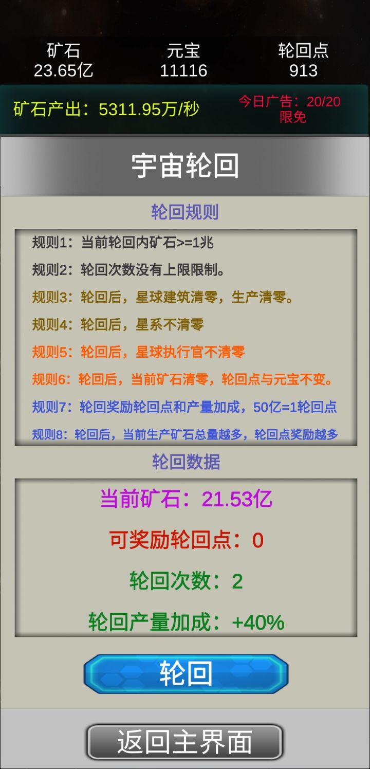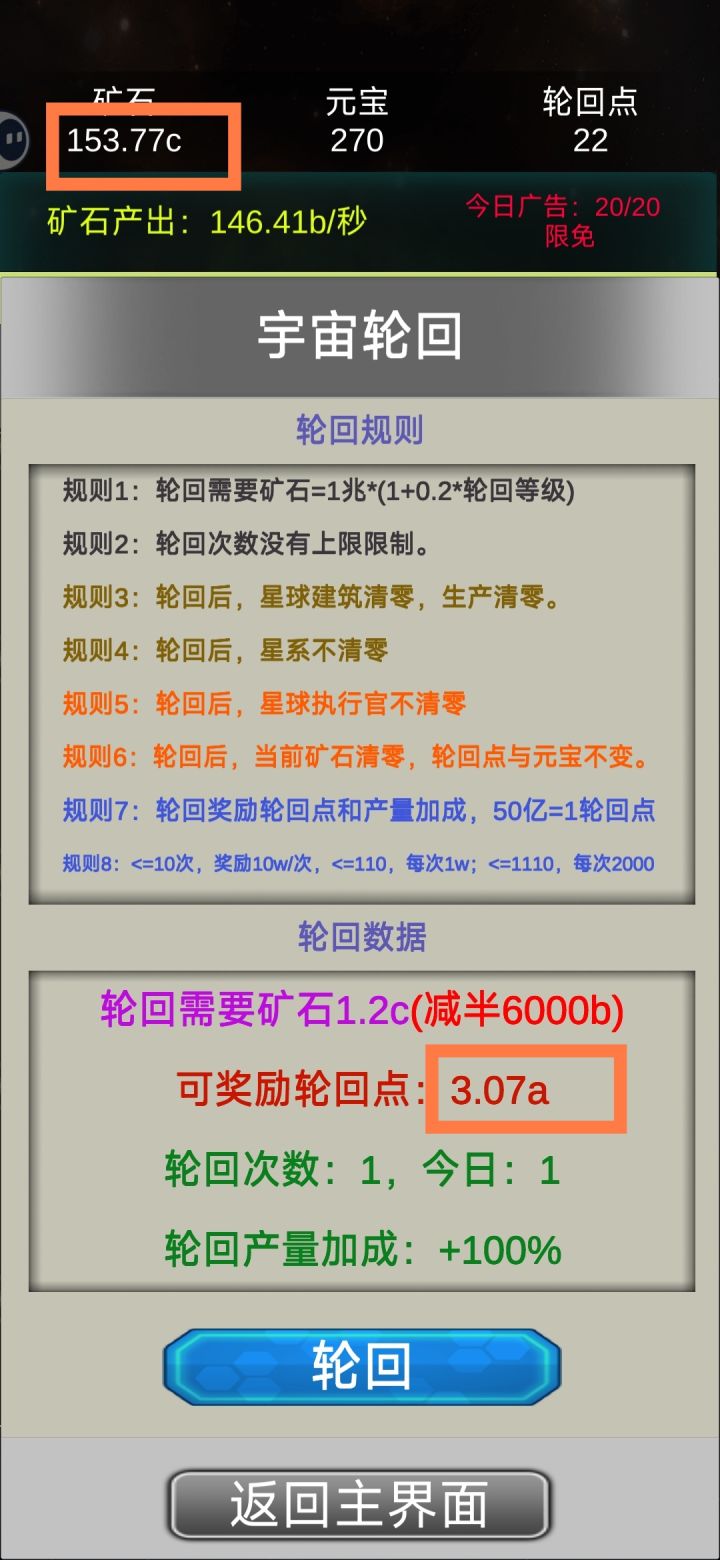 这是我见过最勤奋的作者,由于作者天天努力更新,玩的花样越来越越多,和初始版本玩法也截然不同了。小伙伴们现在最好先不轮回,先用一天时间提升产量,在等一天或者多天+广告时间存产量,第一笔资金(轮回点)就有了,第二次同样这样搞。等有了更新版本在来……!