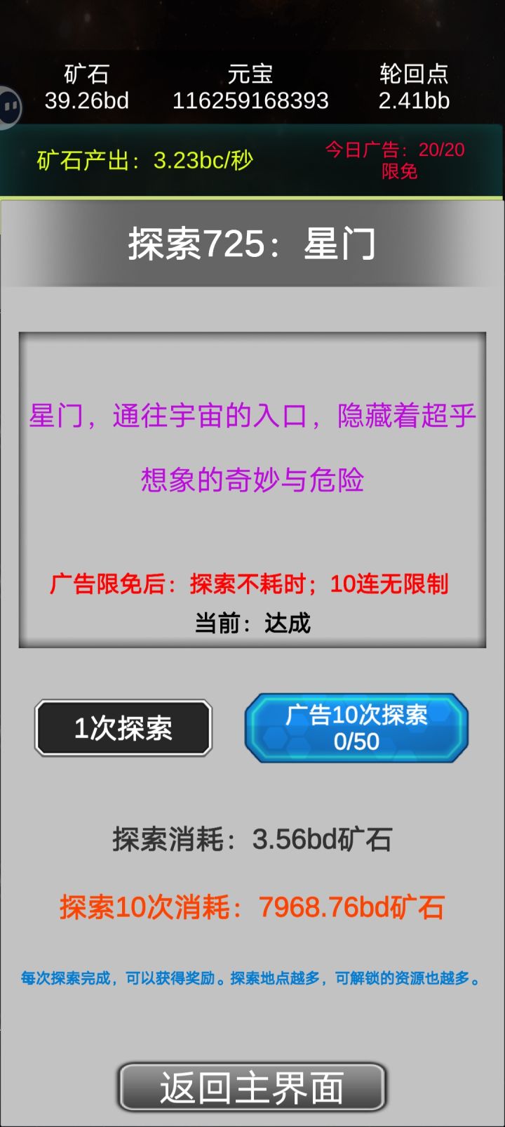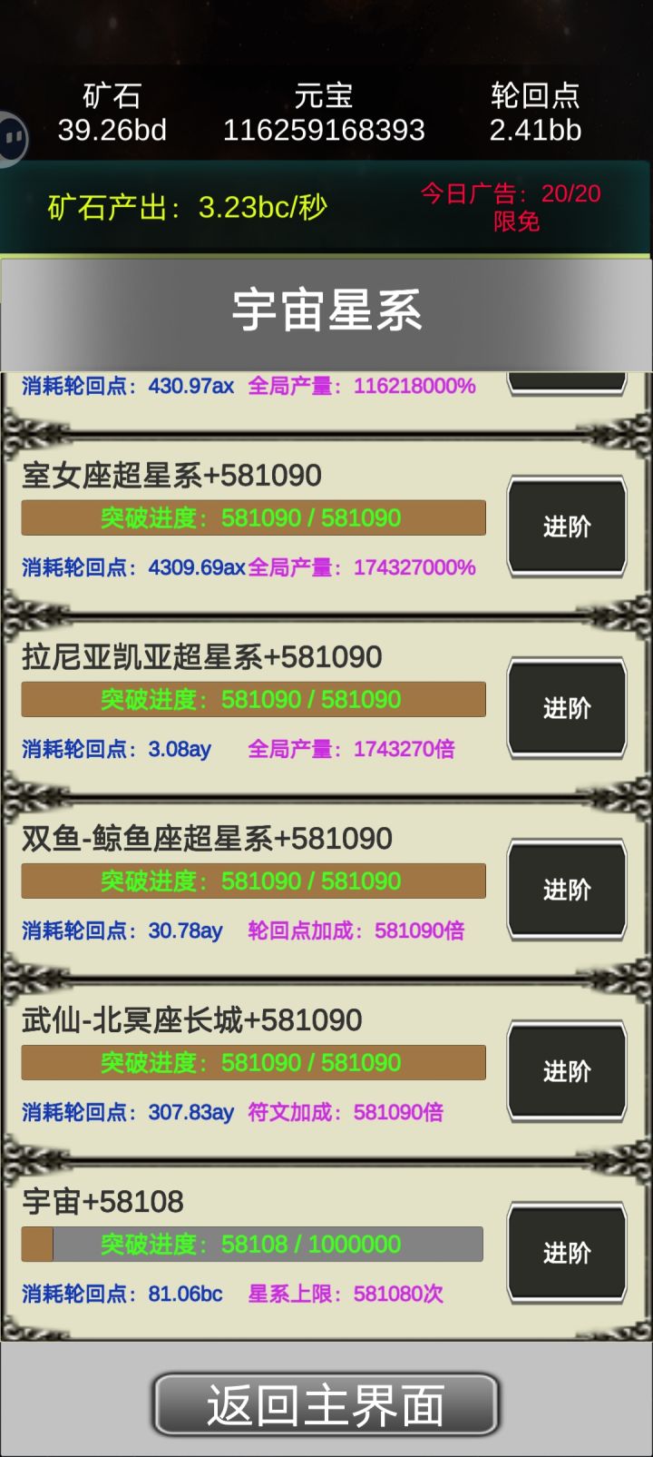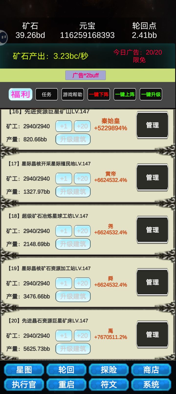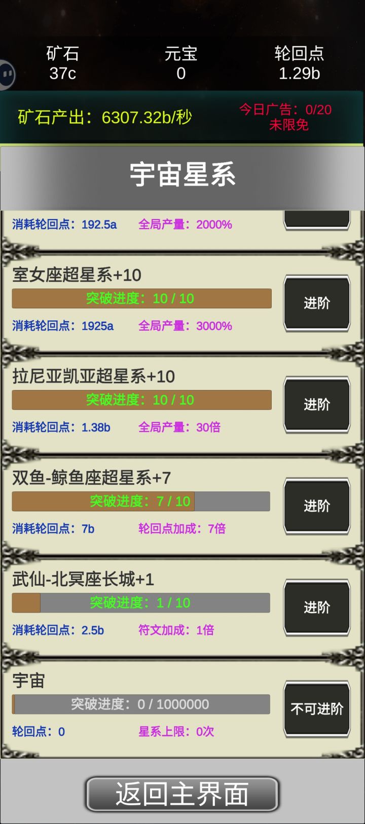 这是我见过最勤奋的作者,由于作者天天努力更新,玩的花样越来越越多,和初始版本玩法也截然不同了。小伙伴们现在最好先不轮回,先用一天时间提升产量,在等一天或者多天+广告时间存产量,第一笔资金(轮回点)就有了,第二次同样这样搞。等有了更新版本在来……!