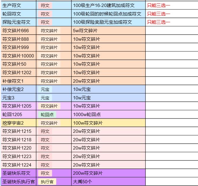 挖穿宇宙001,挖穿宇宙888,挖穿宇宙999,挖穿宇宙1111,挖穿宇宙555,轮回001,补偿001,轮回002,生产符文,轮回符文,探险元宝符文,符文碎片666,符文碎片888,符文碎片999,符文碎片10000,符文碎片50,符文碎片1202,补偿符文1,补偿元宝2,元宝3,符文碎片1205,轮回1205,挖穿宇宙2,符文碎片1218,符文碎片1220,符文碎片1223,符文碎片1224