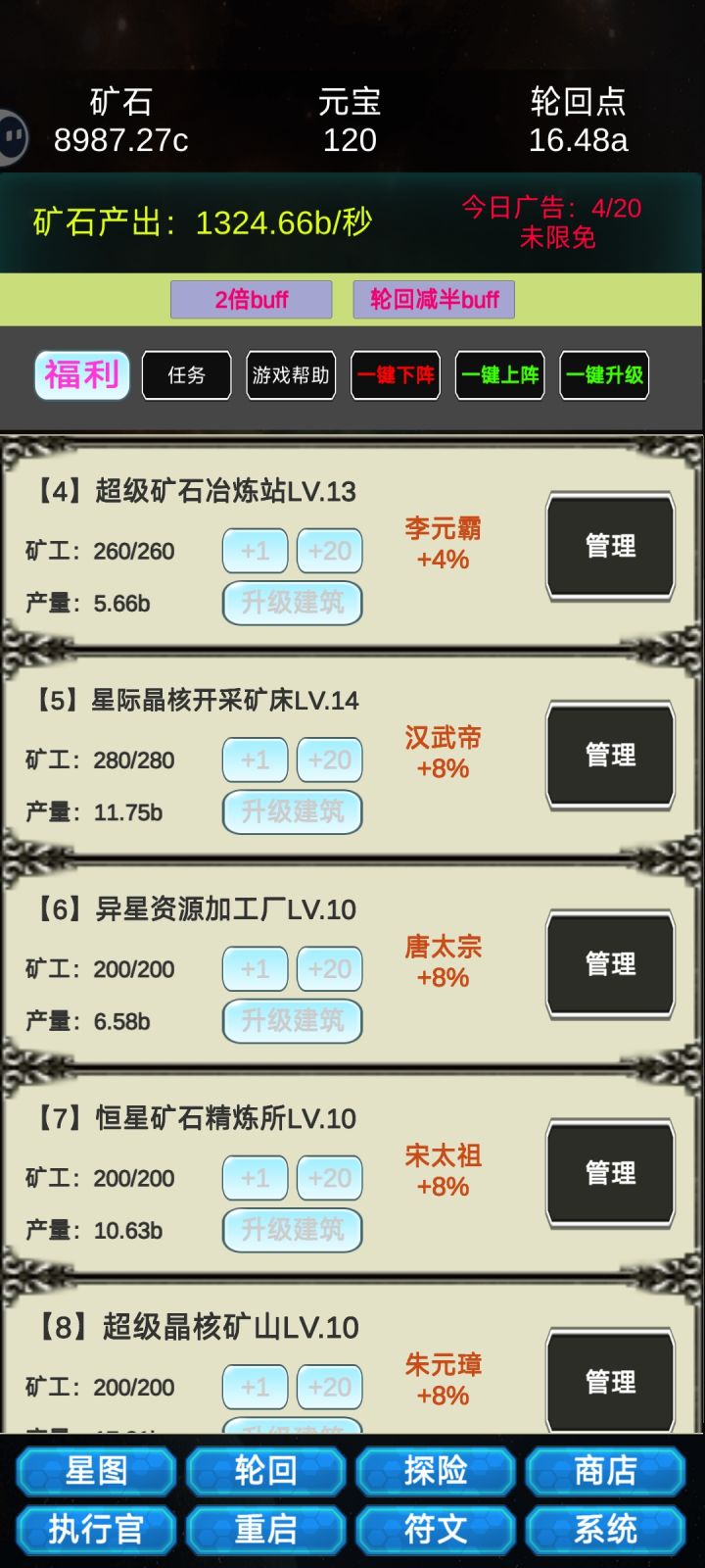 这是我见过最勤奋的作者,由于作者天天努力更新,玩的花样越来越越多,和初始版本玩法也截然不同了。小伙伴们现在最好先不轮回,先用一天时间提升产量,在等一天或者多天+广告时间存产量,第一笔资金(轮回点)就有了,第二次同样这样搞。等有了更新版本在来……!