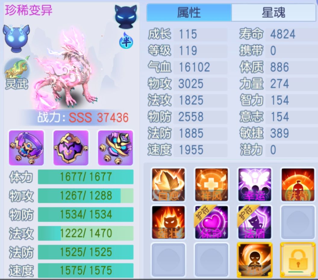 各位少主好,今天我们一起来看看79级刀客,也祝大家早日挖到刀客哦~ 宠物资质成长115全满,物攻、速度资质全满,法攻资质全满(未培养),体力资质接近全满。双防稍低,但对输出宠物影响不大。 宠物属性以力量为主,物攻超3400,输出强劲;气血近7000,生存有保障;速度接近1300,表现不错。 宠物技能裂地+超级连击+超级偷袭+超级吸血+超级强力+超级物穿+超级必杀+高级感知+护符(高级保命+高级隐身