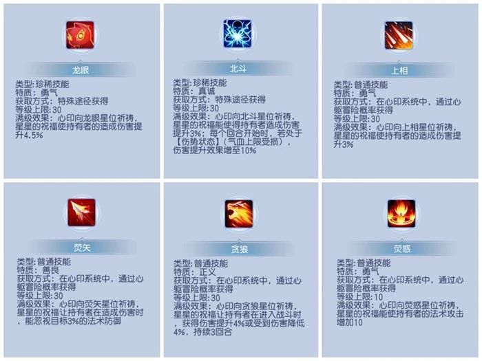 投稿@【文工团】翩翩凡人. (本攻略纯属个人玩法总结观点,非代表官方) 哈喽,大家好!最近了解到许多新区的小伙伴被心印难住了。其实心印系统没有你们想象的那么复杂,不说废话,直接上干货。 【①】心印技能介绍 首先通过[日常→帮助→技能大全→心印能力]来了解心印技能。 每一个心印技能都有详细的技能介绍,并且都有其相对应的特质、获取方式和等级上限。这里需要注意的就是技能的特质,简单点理解就是强化时要输入