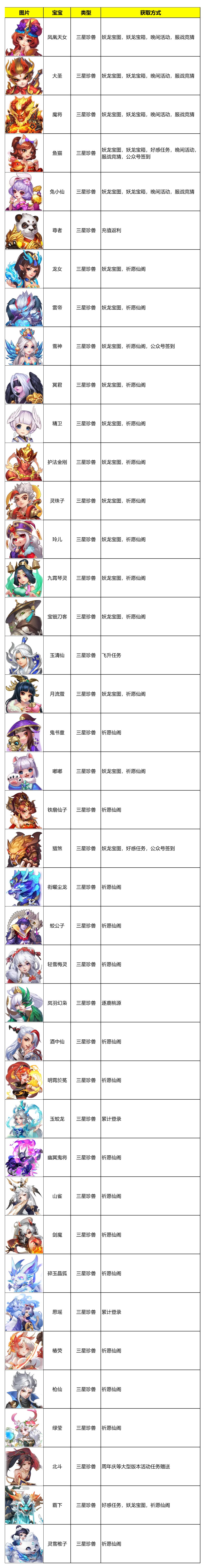 各位少主好呀~今天给新手少主介绍一下目前游戏里部分常用宝宝的获取方式。 1.三星珍兽 2.二星珍兽 3.兽魂 祝愿各位少主早日包圆哦。