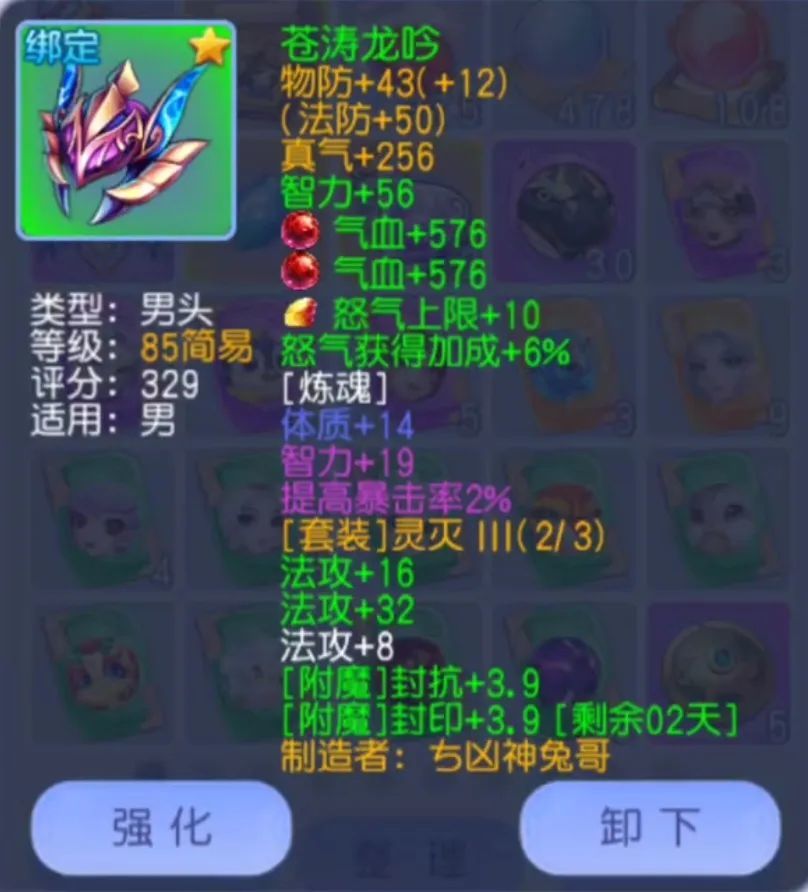 各位少主好,今天做客装备鉴赏栏目的是来自新区的89级大法师,虽然是新区但依旧拥有接近5.1w左右的超高战力以及两紫六蓝的装备,一起详细看看这8件装备究竟如何。 帽子展示 基础属性:紫色简易帽子,物防48,距满分49仅差1点,基础属性优秀。 附加属性:体质 + 智力双加82,兼顾生存与输出,属性完美。 点化:敏捷+18,虽数值不高,但敏捷是最佳选择。 炼魂:智力+15、意志+22,智力偏低,不符法术