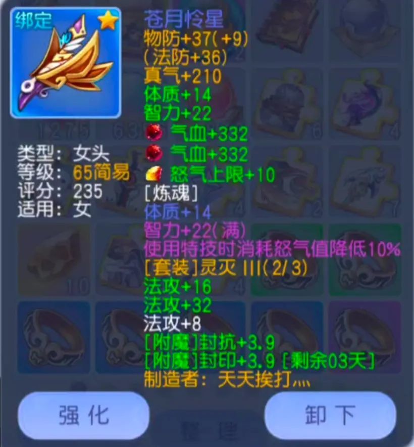 各位少主好,今天做客装备鉴赏栏目的是69级的顶尖法术神秘大佬让我们一起来看看吧。 帽子展示 基础属性:虽然说这个帽子是蓝色品质的,但是物防依旧达到了37! 附加属性:附加属性方面是一个智力和体质的组合,共计36点,其中智力占据了22!怎么说呢?附加属性算得上是中上的一个表现!毕竟蓝色属性附加本来就比较低,其中还夹杂了一部分的体质! 炼魂属性:炼魂,体质14,智力22!属性方面对于法师来说可以说是非