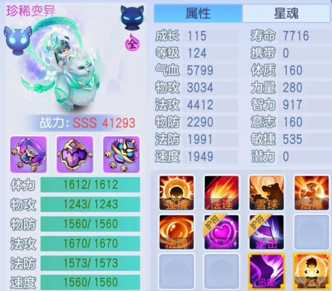 位少主好,今天我们一起来看看三只培养顶尖的灵雪稚子。 宠物资质 成长115全满,体质、物防、法防、法攻、速度资质全满,资质堪称完美。 宠物属性 属性以智力为主,敏捷为辅,法攻4400,速度近2000,但生存能力较弱,124级宠物气血不足6000。 宠物技能 雪球 + 超级法连 + 超级法爆 + 超级法魂 + 超级强横 + 超级气功 + 高级迅捷,护符(高级保命 + 高级逆击)。技能搭配出色,但超级