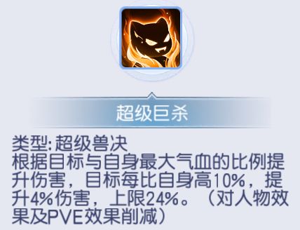 各位少主好,今天我们来探讨一个常被玩家忽视的宠物技能——巨杀。为何说巨杀是被低估的?我们一起继续往下了解吧~ 巨杀-技能分析 超级巨杀:根据目标与自身最大气血的比例提升伤害,目标每比自身高10%,伤害提升4%,最大提升24%伤害。 也就是说,当目标与自身的气血比达到6个10%的差值,也就是60%时,该技能的伤害提升效果达到最大。 相信当大家看到60%的气血比例差时,第一反应往往会认为60%这个数值
