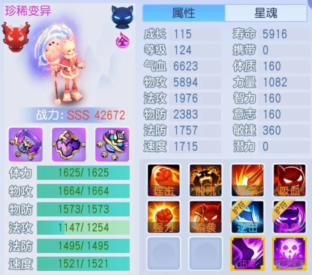 各位少主好,今天带大家看三只109的顶尖物理神宠。 嘟嘟 宠物资质 成长115全满,体力、物攻、物防、法防、速度资质全满,仅法攻未满,整体资质出色。 宠物属性 属性以力量为主,敏捷为辅,物理攻击近5900,速度超1700,但生存能力稍弱,气血仅6600,需通过技能提升。 宠物技能 熊吼 + 超级连击 + 超级必杀 + 超级偷袭 + 超级强力 + 超级吸血 + 高级迅捷 + 高级行尸+护符(高级隐身