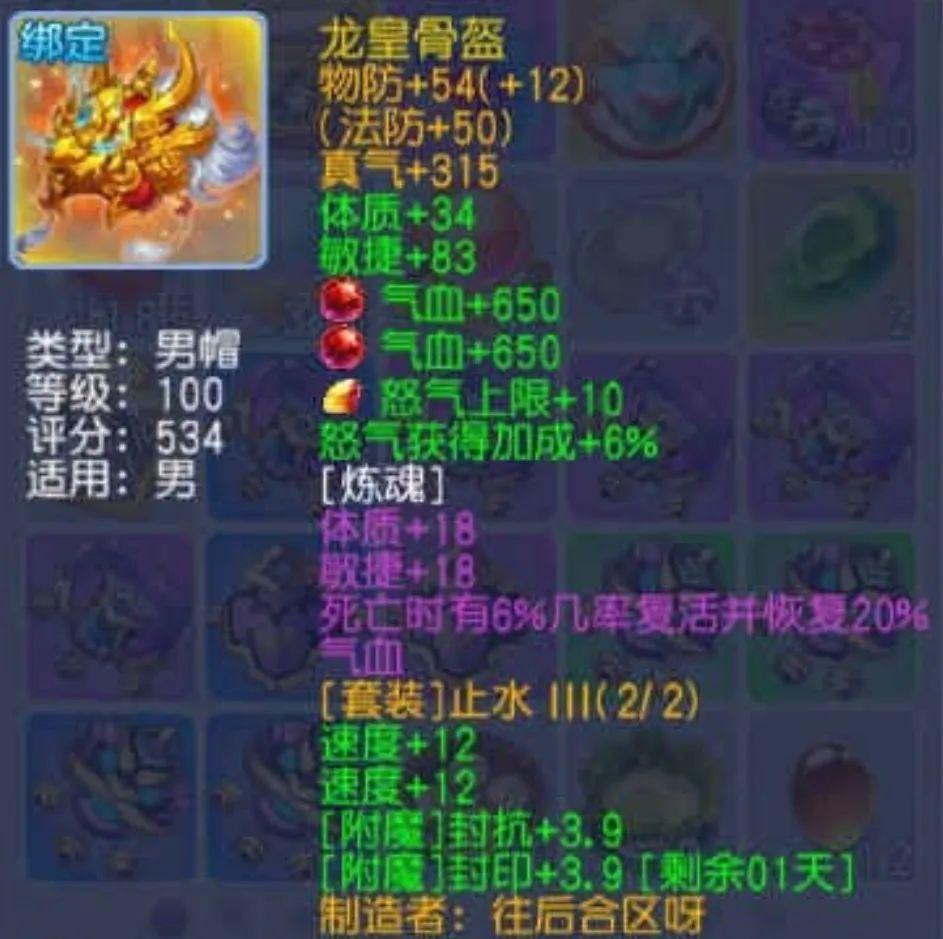 各位少主好,今天做客装备鉴赏栏目的是89级新区的辅助大佬让我们一起来看看吧。 帽子展示 基础属性:先看这顶紫色简易帽子,基础属性为48物防,距全满49仅差1点,表现优秀。 附加属性: 附加属性单加体质82,能显著提升人物气血,安全感十足。 点化:点化为智力20,对治疗职业来说并非最佳选择。这件装备更优的点化属性应为敏捷或意志。 炼魂:炼魂属性体质17、敏捷18,表现一般,提升空间较大。特效为愤怒降