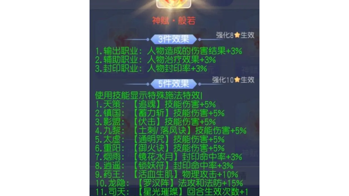 各位少主晚上好本期文章将为大家介绍物理职业镇国府的神赋选择搭配让我们来看看吧三件套:人物造成的伤害结果增加3%。评价:直接提升人物伤害,适合输出职业。五件套:蓄力斩技能伤害增加5%。评价:蓄力斩技能虽有限制,但二转选择战魄可最大化发挥五件套效果。八件套:入场或回合结束时概率触发破釜沉舟,持续两回合。评价:八件套是核心,概率触发破釜沉舟,质变提升镇国府的进攻能力。总结:般若套装非常适合