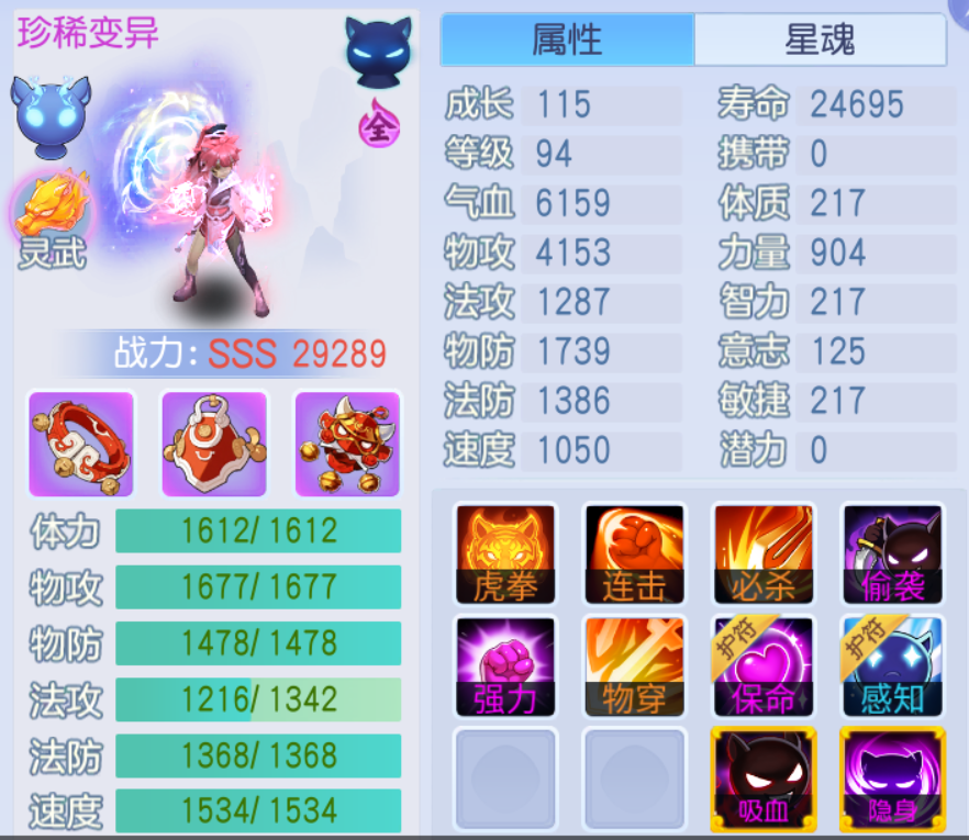 各位少主好,今天我们来看看新区89级大佬的宠物都培养的如何呢?这三只都是来自开区近半年的服务器哦~欢迎少主们点评!宠物资质成长115满,体力、物攻、速度全满,核心资质全满,双防不重要,整体资质优秀。宠物属性力量为主,物理攻击4100+,老区稍显低,新区却给力。6000气血稍弱,1050速度稍慢,但技能可弥补劣势。宠物技能虎拳 + 超级连击 + 超级必杀 + 超级物穿 + 高级强力 + 高级偷