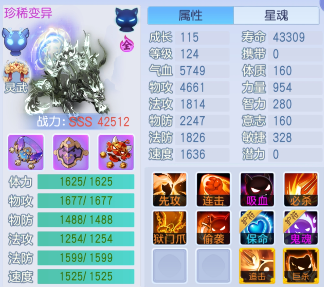 各位少主好,今天我们来看看最新连击宠狴犴的风采吧!宠物资质成长115满,体力、物攻、法防全满,速度和物防稍逊,速度低挺遗憾。宠物属性力量为主,敏捷为辅,物攻4600+,气血不到6000,速度1600+,属性一般。宠物技能狱爪门 + 超级连击 + 超级先攻 + 超级必杀 + 超级偷袭 + 超级巨杀 + 超级追击 + 高级吸血 + 护符(高级鬼魂 + 保命)核心技能完美,高级吸血升超技能更强。护