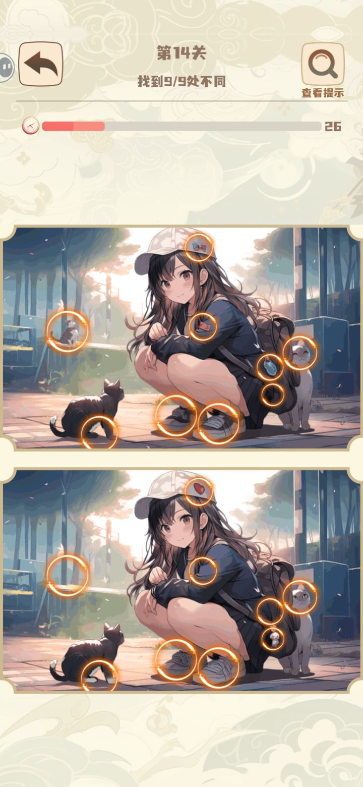 进游戏第一个广告注意看清楚,其次这个游戏太少了,就十来关就没了,最后有一个速通的技巧,把手机横屏,用裸眼3D的技巧把两个画面重叠起来,不一样的地方就会有虚影,会有点闪,很容易就找完了
