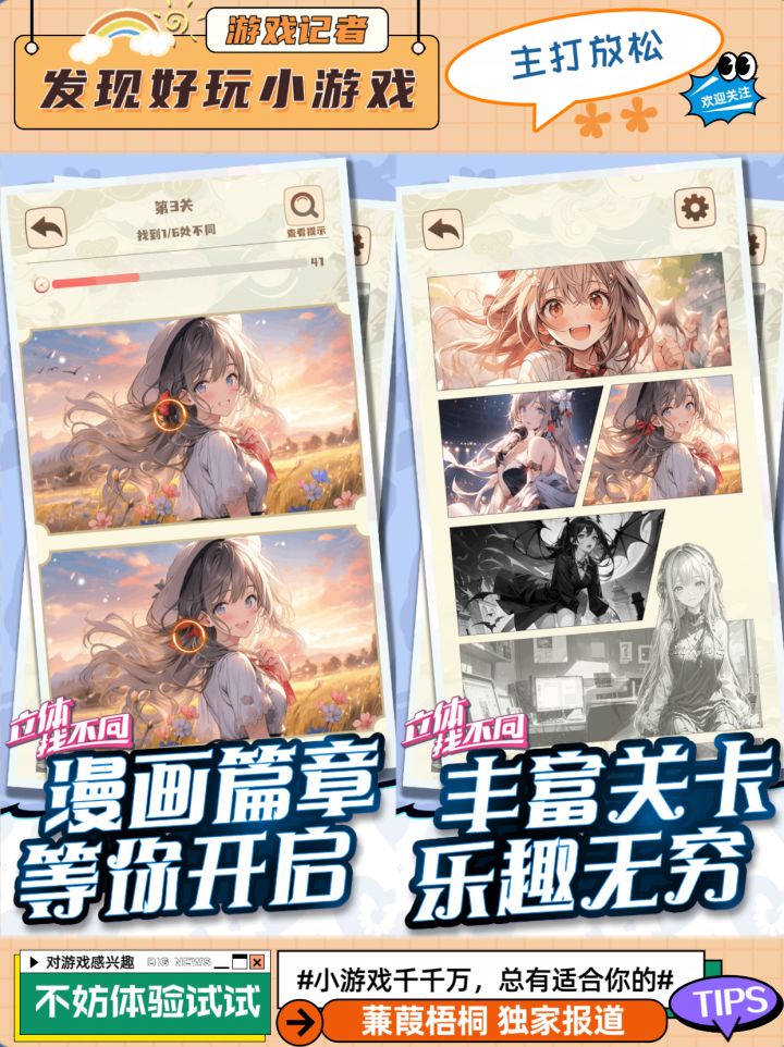 游戏中有精美的画面,人物会迎风摆动,游戏方法为点击两幅图中的不同之处,全部找到即可过关,快来挑战一下吧。#我的游戏日记Vol.4#游戏安利#游戏推荐#休闲游戏#休闲益智#原创