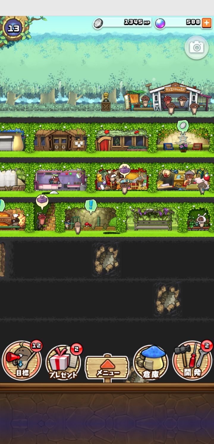 把五层的影院做出来后就没有新任务了。总结三个发现:1. 住所和巢穴里原本有的建筑只能移动,不能收起来; 洞穴探险不能移动也不能收起。其他建筑随意移动和存入仓库。2. 装备屋出产的装备加成以及buff加成是作用于那个种类的所有菇菇,并且不论穿不穿上那个装备,数值和buff都会出现。所以装备屋能算是升级场所[・_・?]3. 菇菇在劳作后血量和心情都会下降甚至可能过劳变成劳模骨干,不,老蘑菇干