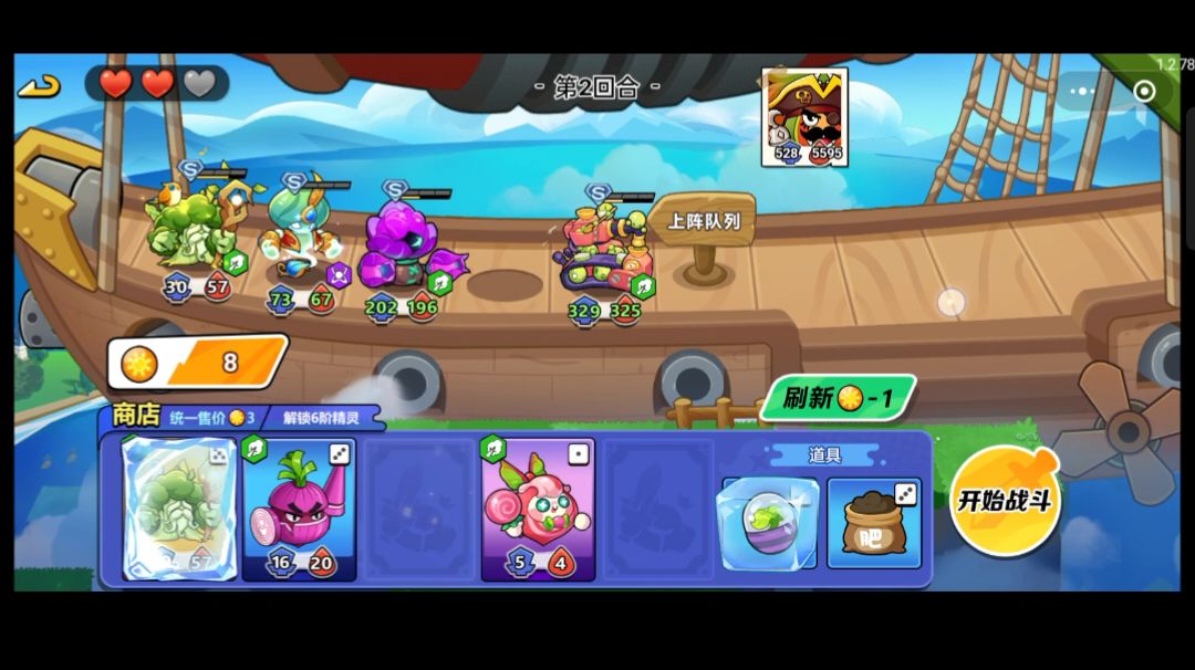 阵容:种子 模仿果 鸭梨将军 杨桃(五级) ——前期,后期随意 主c:杨桃(尽量追s) 第一局每张牌都上一张,运气好可以多追一张杨桃,保证卡槽里面的牌尽量都是高攻血,道具记得卡拳套。第二局让杨桃去s,没有s也没关系,多卡高攻血牌就行。第四局就是卖掉种子,还是老样子,卖掉之前1和3号位换一下,然后给杨桃吃拳套。后面随便补就行了。因为都是发的不氪金玩法,投入的经历跟时间可能会多一些,多试几次就可以了。