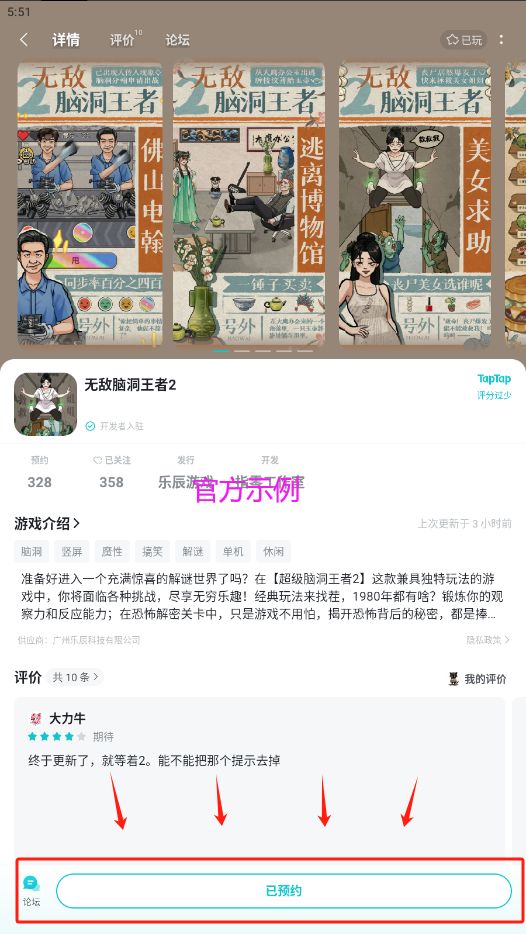 乐辰欢乐福利大派送第二周也是如约而至啦~已经出到第二部的「无敌脑洞王者2」,你不想试试吗?「无敌脑洞王者2」将在11月17日10:00正式上线TapTap,游戏中新增许多丰富的解密关卡和新奇有趣的剧情关卡,你还不来试试吗?距离游戏上线仅剩3天,现在点击预约还能获得超多福利和惊喜奖励哦!中奖后请记得加入我们的官方Q群: 即可找寻群内可爱的的客服妹子进行登记后领取您的奖励啦~【活动时间】11