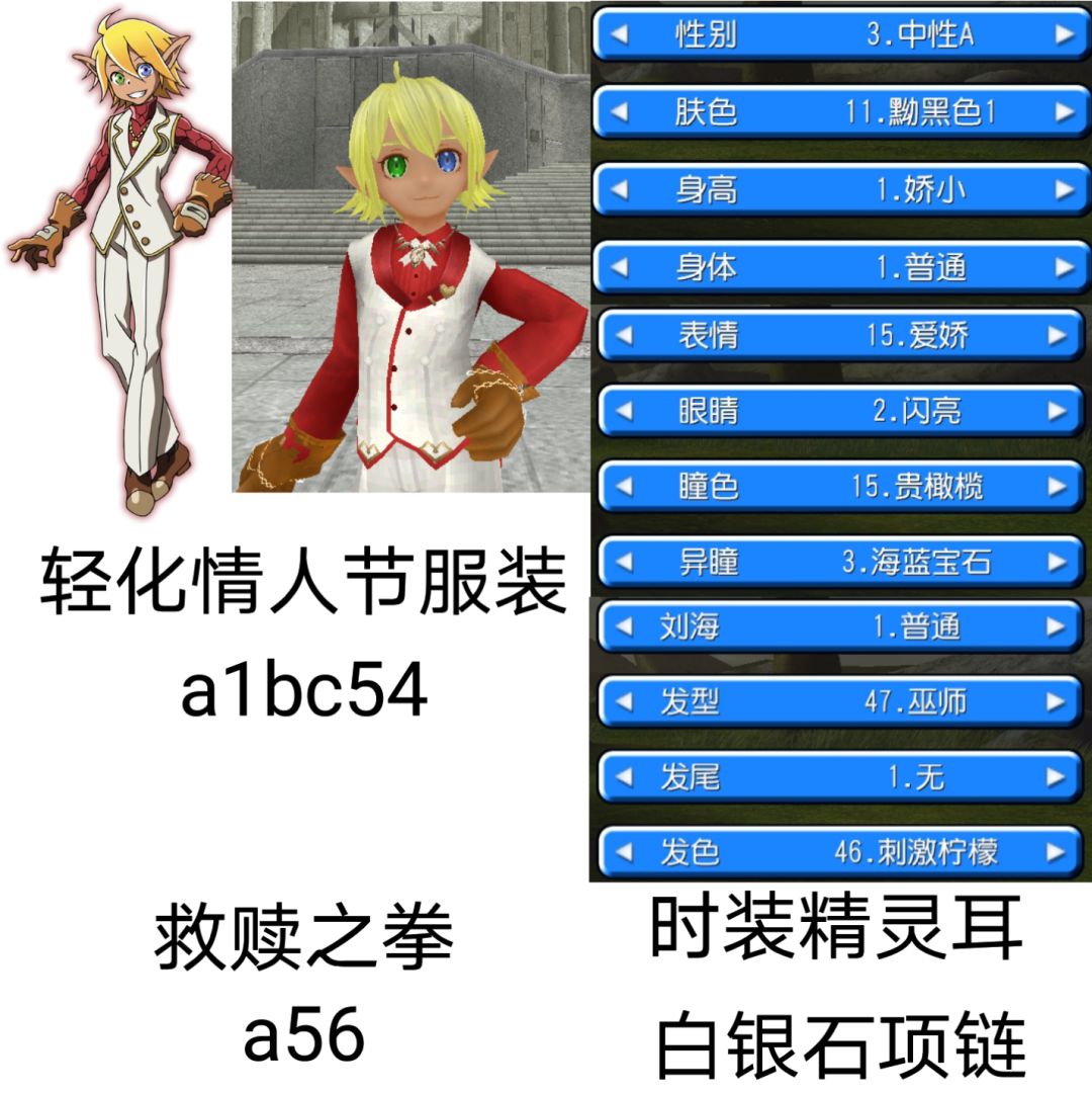 -白银石项链 (达加诺平原滚石兽掉) -轻化情人节服装 (情人节活动) (染色a1bc54) -救赎之拳 (万圣节活动铁匠铺) (染色a56) -时装精灵耳 非常好cos,爱来自作业帮,我会抄更多() 下面这个细节不太好,可能是按印象捏的吧 幸好武染殿没结束,非酋的我花了几天时间终于打到了合适的拳染 取景自多洛马广场,纳萨力克(信天翁)大坟墓() 其实要不要拳套、精灵耳、项链都无所谓,