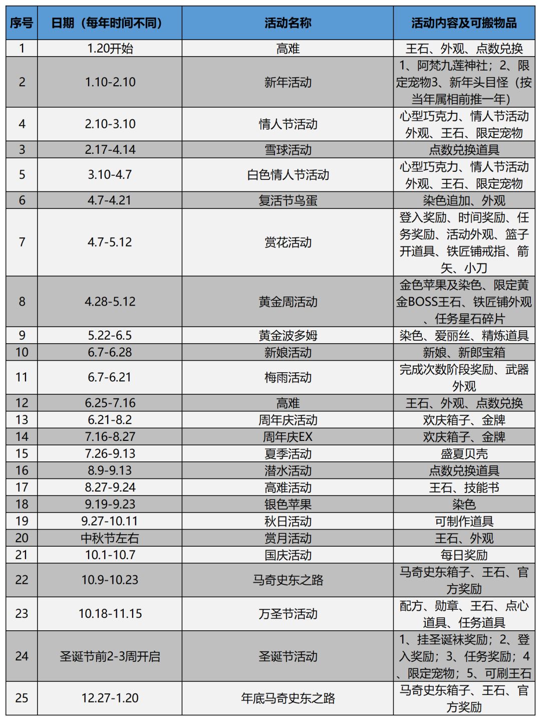 闲来无事整理了一下全年活动,以供查询了解。其中有很多可以搬砖的活动,可以帮助萌新获得启动资金。 写在前面: 1、帖子里列举个人认为可以搬的物品(主观性较强,仅供参考),物品价格参考活动期间便宜,活动过后可能涨价的规律,所有价格请自行板子查看。 2、大部分活动都会有活动外观、限定配方,因此外观仁者见仁智者见智,活动开启可以自己先刷材料去敲一下看看,或者参考防己大佬的全活动外观帖。 3、限定宠物各活动