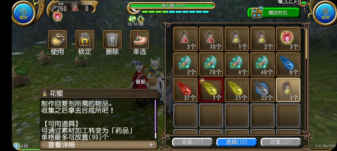 可食用道具 花蜜,17级怪物奇基姆掉落(掉率偏低) 食用可恢复10点魔法值。 美味度:★★★ 实用性:★ 评语:入口甘甜,回味良久,非常美味,可以很好的恢复疲劳,由于其恢复效果极佳,因此常常被炼金术师拿去作为制作恢复药剂的主要材料。 可食用道具 再生药剂Ⅰ,22级怪物哥布林掉落 食用后,五分钟内每三秒恢复10体力值 美味度:★ 实用性:★ 评语:没什么特别的味道,这就是药剂,不是食物。 因为论坛限