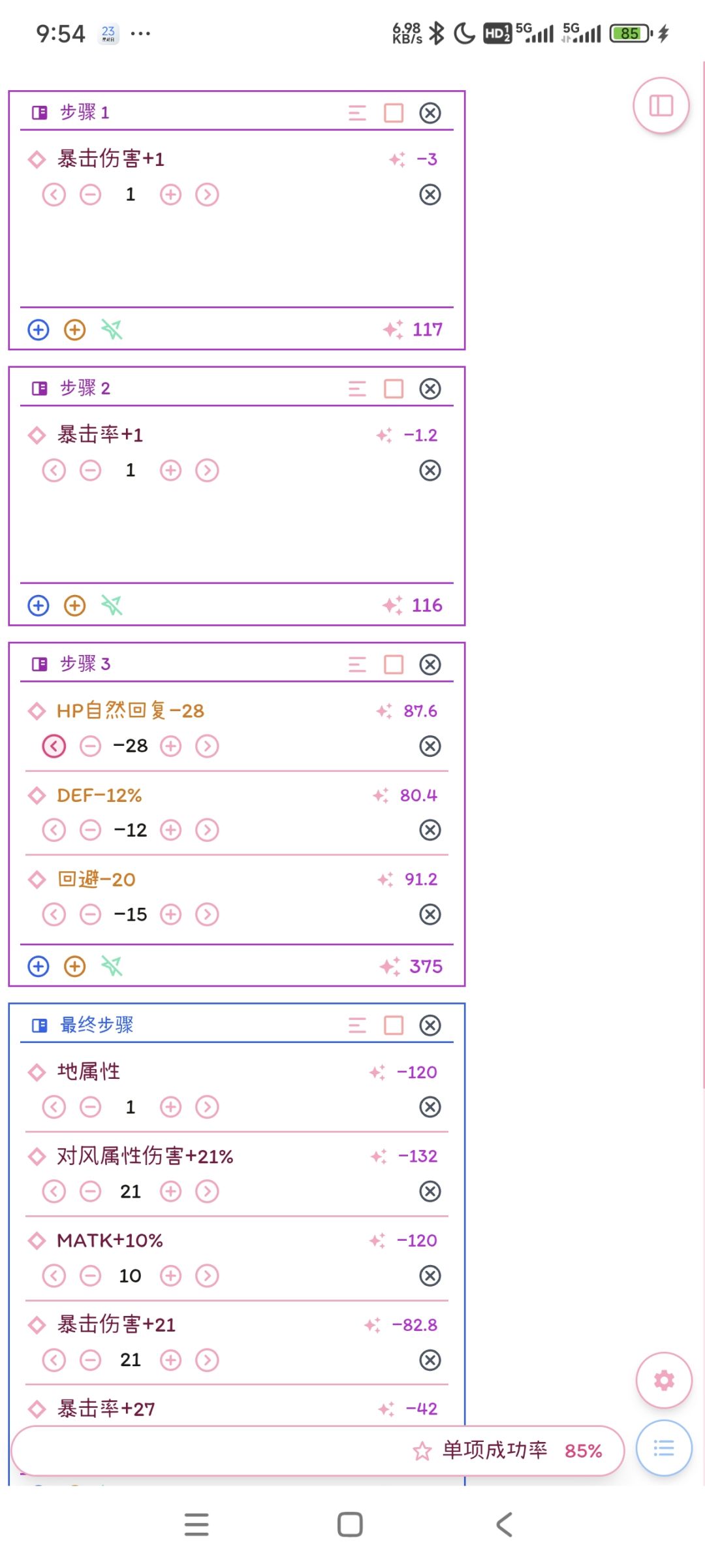 ✩ 主手武器 装备初始潜力值|1 基础锻造熟练度|0 制作装备基础潜力值|0 ✩ 最终结果 DEX+10%|STR+10%|DEX+27|回避-14|DEF-10%|MDEF-10%|回避-6%|MP自然回复-5% ✩ 素材耗量 金属 38500|兽品 19250|木材 5500|布料 41600|药品 192500|魔素 0 步骤数|6 1. 附DEX+1%|回避-4|15pt 2. 附STR+