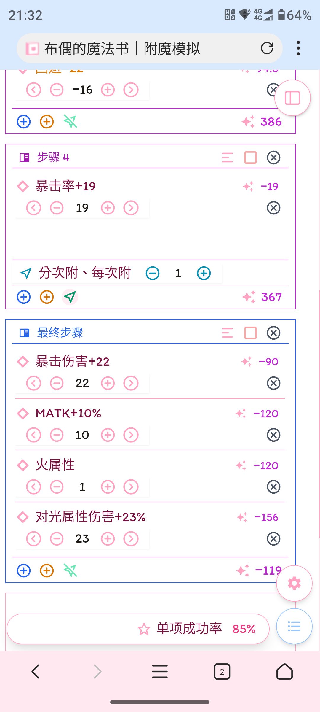 ★法杖默认为四周年杖(68-72潜) ★由于本人使用的魔导交互网络损坏,这些公式为本人手写。个人习惯将退潜补正值单独拿出,所以退潜pt计算看上去有点奇怪,但最终结果是没问题的。 ★公式后的成功率为每条属性成功率,如≧100%,则可稳附,如<100%,最终成功率为公式后成功率的八次幂 ★欢迎各位提出可能出现的错误或优化方案,本人不胜感激! ◆终结通用法杖 ◆终结对属法杖 ◆爆能用杖 ◆通用防具