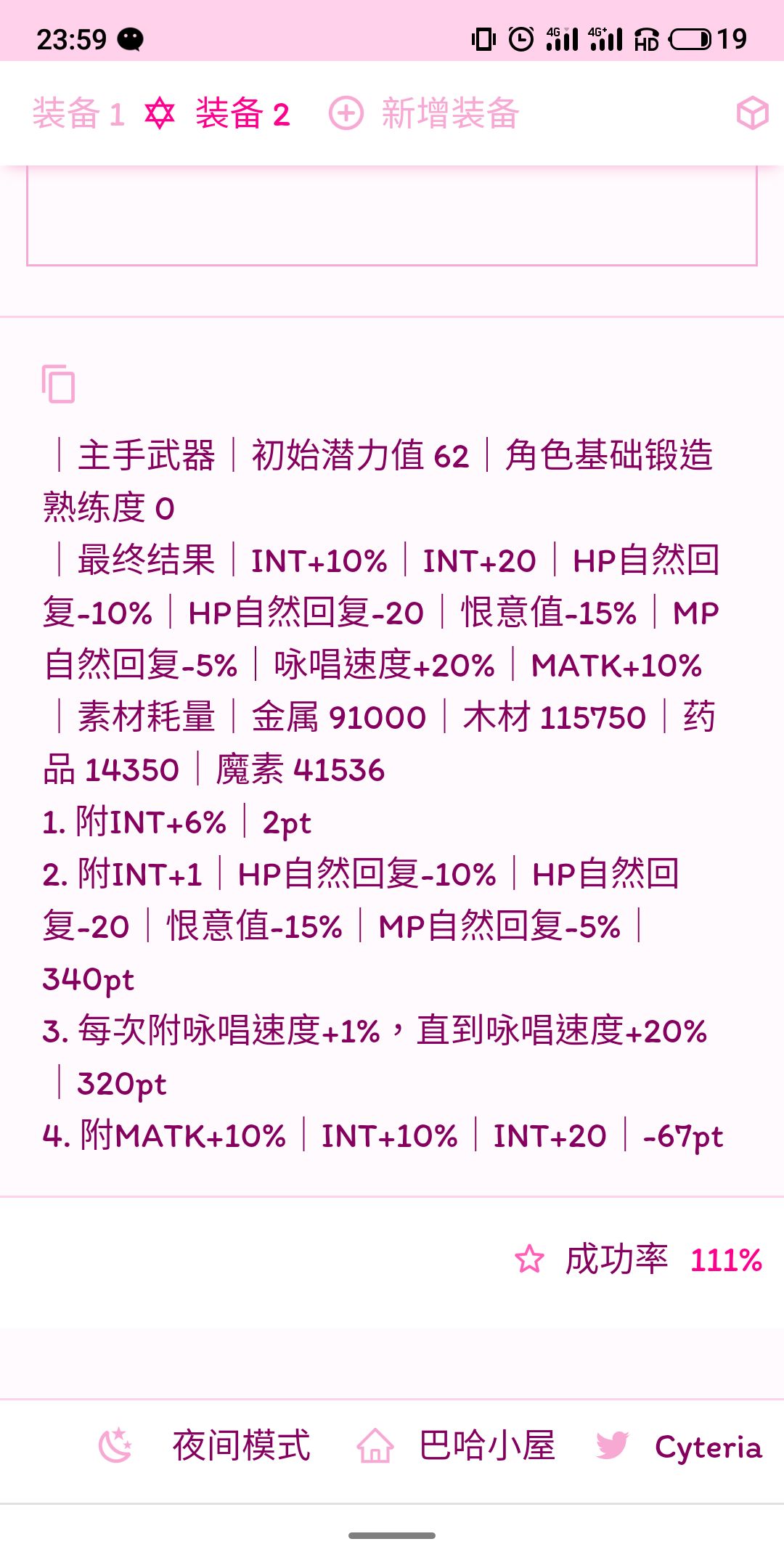 ✩ 主手武器 装备初始潜力值|71 基础锻造熟练度|0 ✩ 最终结果 光属性|对暗属性伤害+20%|ATK+10%|暴击伤害+10%|HP自然回复-21|DEF-10%|回避-5%|抗光属性-21% ✩ 素材耗量 金属 102025|兽品 19250|木材 0|布料 5500|药品 0|魔素 173925 1. 附对暗属性伤害+1%|66pt 2. 附HP自然回复-21|DEF-10%|回避-5%