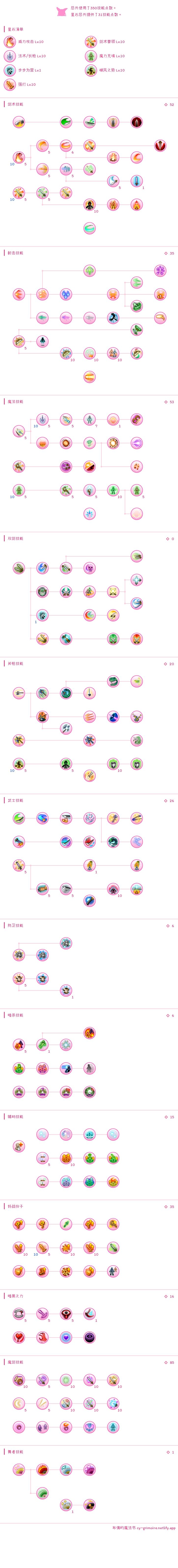 |总共使用了333技能点数。 |星石总共提供了26技能点数。 星石清单 |威力攻击 Lv.10 |魔力充填 Lv.10 |步步为营 Lv.1 |破风之势 Lv.10 |提升攻击力 Lv.10 |强打 Lv.10 剑术技能 |威力攻击 Lv.5 |迅捷攻击 Lv.5 |横扫千军 Lv.5 |爆气斩 Lv.10 |音速斩切 Lv.5 |真空刃 Lv.5 |破坏之刃 Lv.5 |剑术要领 Lv.10 |剑速提升 Lv.5 |大师级剑术 Lv.10 |完封 Lv.10 |灵气之刃 Lv.1 射击技能 |弓术要领 Lv.5 |远程狙击 Lv.10 魔法技能 |法术/飞箭 Lv.10 |法术/长枪 Lv.5 |法术/魔法枪 Lv.5 |法术/冲击波 Lv.7 |法术/终结 Lv.1 |法术/障壁 Lv.5 |法术/引爆 Lv.5 |法术/暴风 Lv.5 |法术/爆能 Lv.5 |魔力充填 Lv.5 |缩时咏唱 Lv.8 |强射 Lv.5 |魔力灌充 Lv.10 |法术/魔法炮 Lv.10 |法术/毁灭 Lv.1 |急速充填 Lv.5 双剑技能 斧枪技能 |破风之势 Lv.5 |逆境怒吼 Lv.5 |神速掌握 Lv.10 武士技能 |武士道 Lv.5 |缩地法 Lv.1 防卫技能 |轻防具要领 Lv.5 |幻象迷踪 Lv.1 辅助技能 |生命能源 Lv.5 |勇气泉源 Lv.10 好战份子 |提升魔力 Lv.5 |专注 Lv.5 |顽强抵抗 Lv.5 |魔力增幅 Lv.5 |分段爆裂 Lv.10 |提升攻击力 Lv.5 |强打 Lv.5 |提升暴击率 Lv.10 锻冶大师 |素材加工 Lv.1 魔剑技能 |魔法战士的要诀 Lv.10 |转化 Lv.10 |魔力共鸣 Lv.1 |空灵闪焰 Lv.5 |元素斩劈 Lv.5 |附魔剑击 Lv.10 |附魔爆发 Lv.10 吟游诗人 |即兴演出 Lv.1