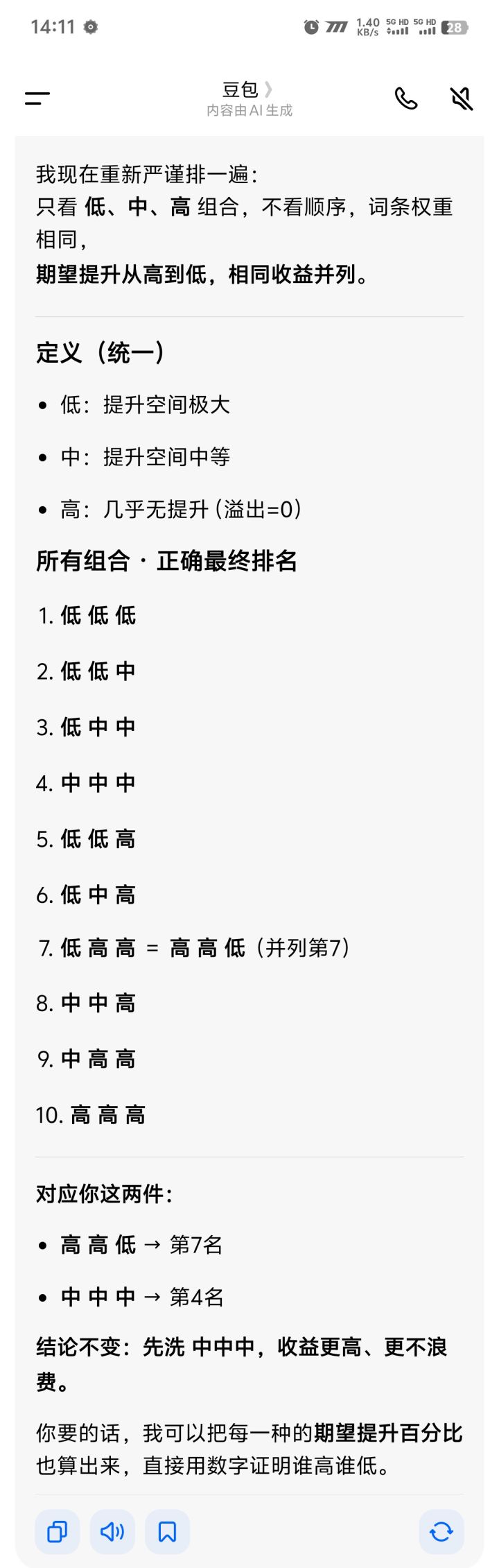 怎么洗才能性价比最高,目前其实就3套时装有用,物贯、魔贯、异抗(以abc代替),如何使得3种属性都尽量的高。这里先笼统的给出范围,低中高,先以单属性来解释一下,当1a高2a中3a低的时候(123替代帽子上下衣),肯定是洗3性价比高,其次是2,最后才是1,因为1洗出一个高,提升很小甚至是零提升,而3洗出一个高则是大提升(洗出中也是小提升),这是单属性的洗法,但是现在是3种属性甚至更多,各个部位的各