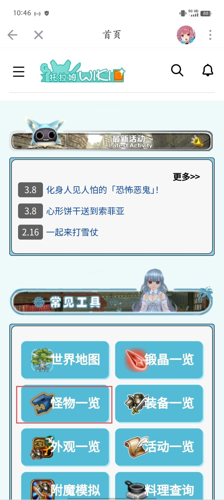 停更将近一年的wiki恢复更新了(*/ω\*)目前最推荐的功能是怪物一览,小怪数据已完全完善,boss也已基本跟上版本(用来查询小怪掉落非常好用,练匠狂喜)其余功能大多也已恢复更新,期待大佬完善https://wiki.biligame.com/toramonline