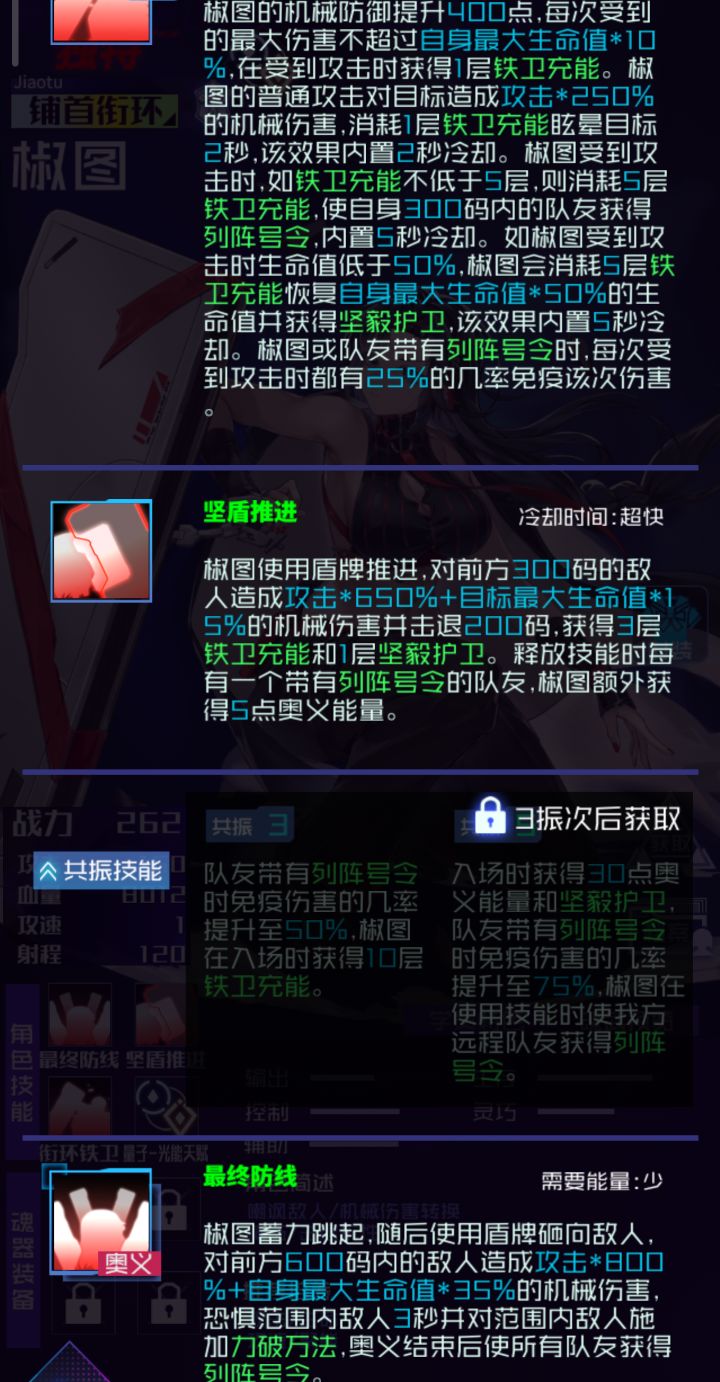 PVP T1PVE T1技能介绍新机制 嘲讽 【坚毅护卫】80减伤80抗性嘲讽敌人被动10%限伤,【铁卫充能】10加攻10减伤*15层,可给队友60减伤和机伤转换技能嘲讽,奥义对敌技能CD+2,限伤4倍攻击总体效果一般,目前2种配队方式都不太行1配佩莎双坦但浪费位置2配4远程效果不如5远程魂器芯片火车头、礼盒、五福到等,群体增益或减益阵容见解析阵容推荐