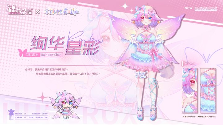 【背景故事】 来自精灵王国修行千年的蝴蝶小精灵,为了守护人类的微笑而诞生于此,她熟练掌握爱与温暖的魔法。在这旅途中,她收留了无家可归的小狗并使其幻化为蝴蝶小狗,一同去往人类世界为人们带来快乐。听说,爱上蝴蝶精灵的人类会变成蝴蝶糖果供用给蝴蝶精灵食用哦~那种糖果的名字就叫彩彩糖。 —————————————————— 「绚华星彩-彩虹酱」限时回归! 下载游戏:https://www.tapt
