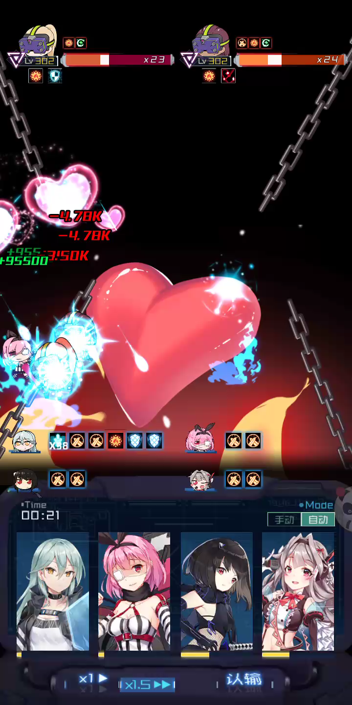 喵球-重甲闪避-冈格尼尔, 胧-嗜血暴击-开天神斧, 琉璃-重甲血量-丘比特, 莱拉-重甲血量-风扇娘。 由于我的胧只有一振_(:з」∠)_,衔接过程略不顺畅。