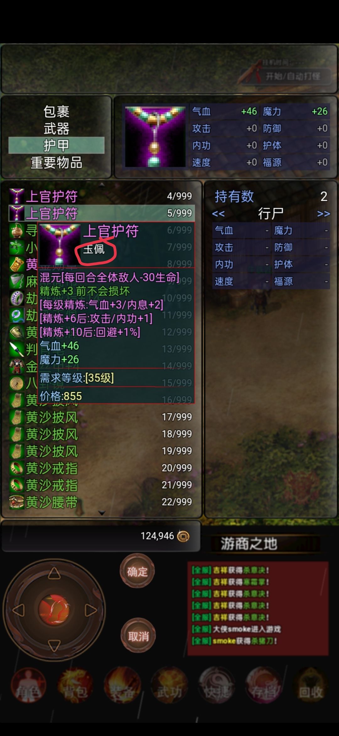 这款这款游戏有三个职业。力士侠客隐衣,本人就玩了一下力士。 这款游戏的攻防属性非常重要。想要安全挂机。你的防御最好和怪物的攻击持平,就可以做到无伤挂机。 前期的游戏开局大家最好。可以刷一个红色的小师护符(加防御的),然后把能领的东西都领上,就可以去杀的小鸡,鹿,再升个两三级就可以去杀稻草人了。然后就可以报你的第一件装备。如果不赶时间可以直接杀小鸡,一直杀到五级。然后可以去找游老板买一身五级流沙