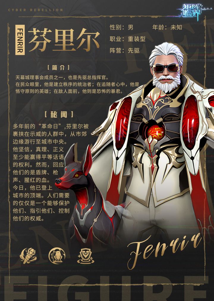 监察官们好,我是莱薇!前几日,先驱总指挥官芬里尔的露面引起了大家的激烈讨论,芬里尔也将在5月8日正式与大家见面啦!让我们一起看看芬里尔的独家介绍吧~✦角色基础信息✦姓名:芬里尔性别:男身高:195cm生日:8月15日阵营:先驱职业:重装型身份:天幕城理事会成员之一,现任先驱总指挥官个人语录:屠龙者躺在金山之上,变成了新的恶龙...✦芬里尔的彩蛋✦在本帖评论区处评论“芬里尔