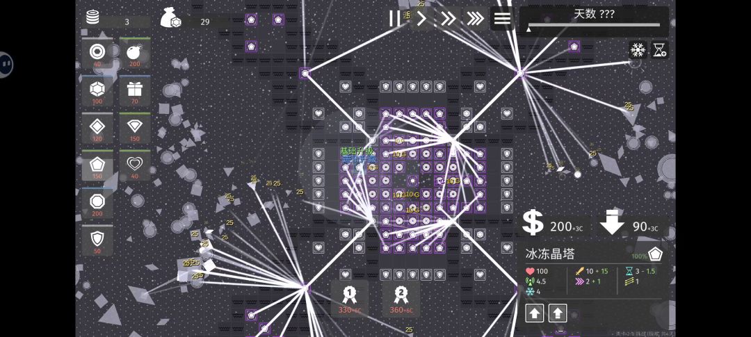 很精巧的塔防游戏,手机端第1、2章全极难通关了!一些打极难的心得: 1、即将用完或被敌人摧毁的临时箭塔、临时治疗晶塔、复活晶塔可以卖掉回收一半钱。 2、临时治疗晶塔和复活晶塔也可以接入折射晶塔,囤复活晶塔配合紫盾能扛很久。 3、箭塔作为这个塔防游戏中的“豌豆射手”,实际上的战斗力并不差,是前期过渡的优秀选择。 4、由于胜利方式是坚持而不是全歼,在最后一天可以用卖塔、降级、炸弹甚至是利用日光塔来拖时