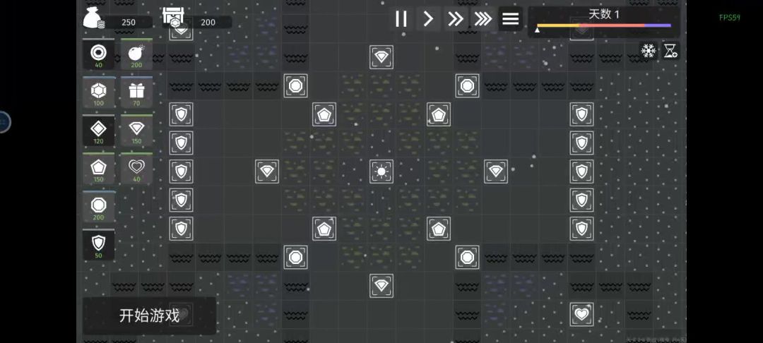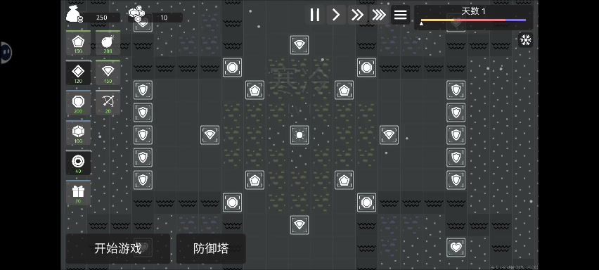 用到的塔(冰冻,激光,折射,冰炸,冰金矿,水晶矿) 思路:优先先把金矿升满,攻击塔主冰冻塔(因为怪多需要减速拖到太阳升起,并且越冷攻击越高),副激光塔(因为冷却时间问题,只要一个冰塔打到游戏结束都种不满),折射塔一冷却就种(先让折射塔能相连到最远的距离,为了寒冰塔能提前减速怪物),寒冰炸弹或者炸弹作为容错种植,无要求,最后黑夜降临开始卖金矿水晶矿升级边角(边角不容易被攻击)的攻击塔,基本思路就这样