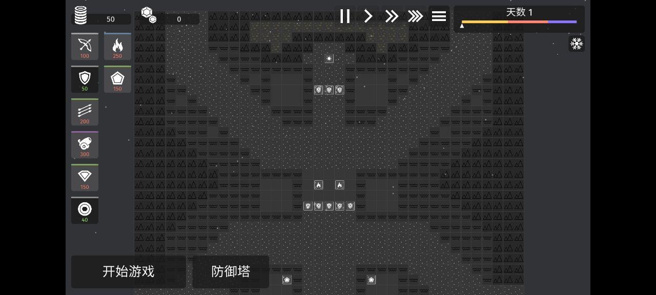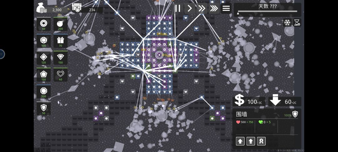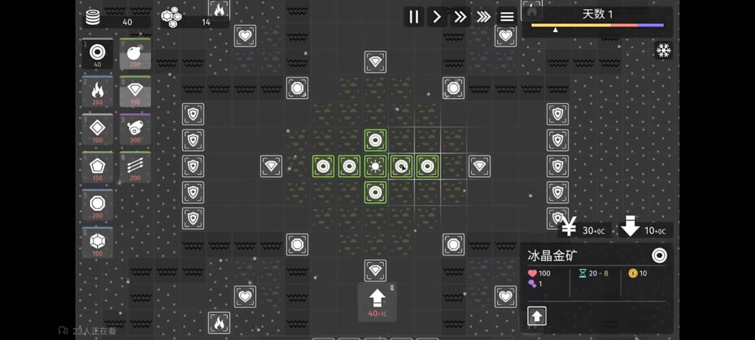 用到的塔(冰冻,激光,折射,冰炸,冰金矿,水晶矿) 思路:优先先把金矿升满,攻击塔主冰冻塔(因为怪多需要减速拖到太阳升起,并且越冷攻击越高),副激光塔(因为冷却时间问题,只要一个冰塔打到游戏结束都种不满),折射塔一冷却就种(先让折射塔能相连到最远的距离,为了寒冰塔能提前减速怪物),寒冰炸弹或者炸弹作为容错种植,无要求,最后黑夜降临开始卖金矿水晶矿升级边角(边角不容易被攻击)的攻击塔,基本思路就这样