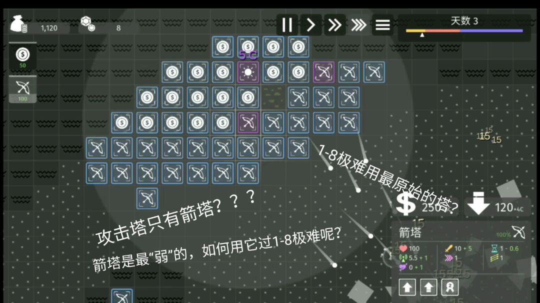 1-8官方挑战关固定只能用金矿、箭塔、炸弹,但建造冷却变为原先的0.8倍。这个自创挑战则进一步加强 首先,我只用金矿和箭塔,不能用炸弹缓解攻势,输出全靠箭塔。其次,找玩的是战役,这意味着冷却没缩减,从而限制了塔的数量。第三,我全程不暂停,并且第3天夜幕降临前只开2倍速,缩短了反应时间。最后,开局不用临时箭塔,也增加了发育难度 虽然最后也是过得极限,不过个人感觉还能提升。可以看出官方的“极难”并没有