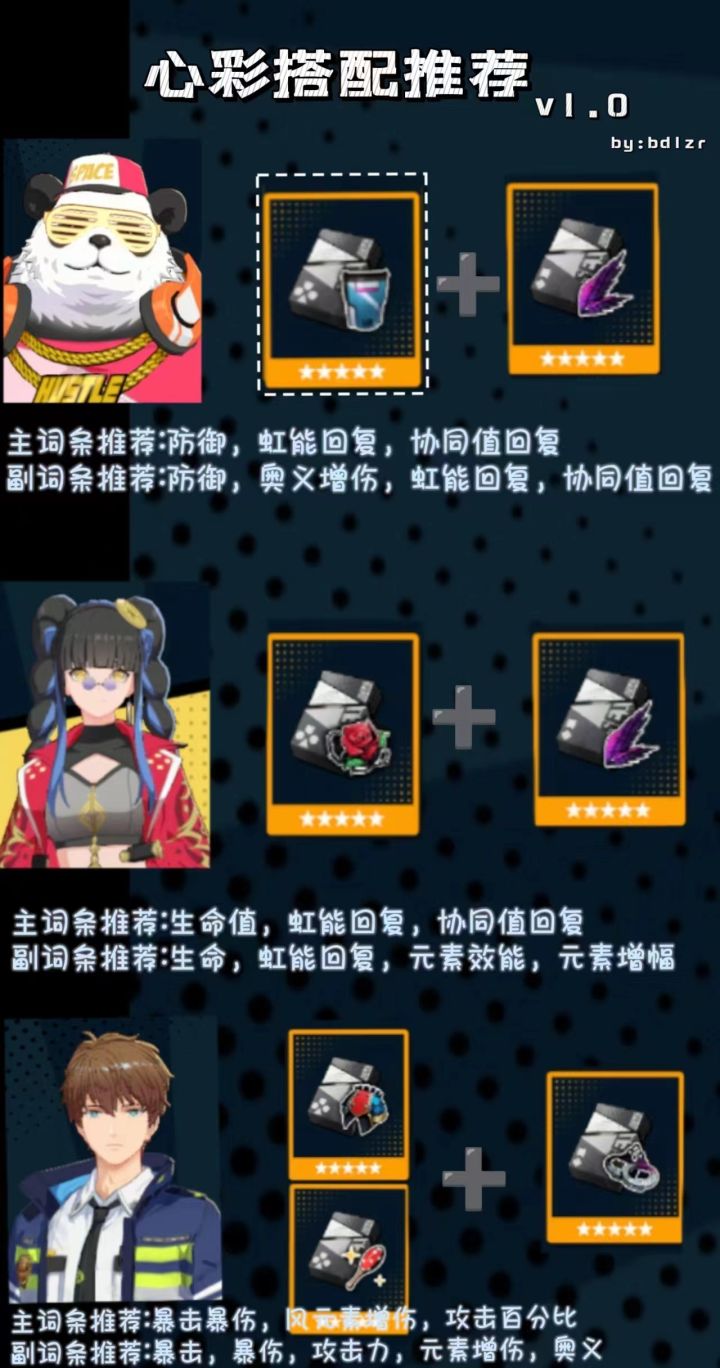 本文内容基本都是根据个人对角色的使用定位及角色输出效率的总结,仅代表个人观点,请各位所长酌情选择参考。不喜勿喷,友善讨论,欢迎提供更多搭配思路。三号位固定词条生命值图中4件套搭配为2+2不同系列或者4件同系列关于心彩的获取:善用背包中的回收功能和菜单中的合成功能#今天游戏圈发生了啥 #游戏安利 #游戏讨论 #攻略 #飞跃虹镜 #浅评一下
