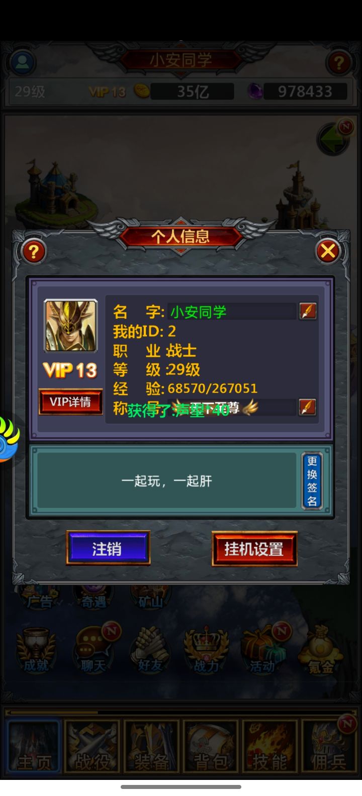 【活动奖励】幸运奖励50名,每人可以获得1张68奖励券!【活动时间】1月12日00:00——1月18日23:59分活动期间,各位小伙伴前往游戏中,截图游戏里的角色ID界面并将截图发在评论区并附上自己所属的游戏区服,即为参与成功。活动结束后,我们将随机抽取50名幸运玩家,发放活动奖励。游戏id截图获取方法:1、进入游戏;2、点击左上角角色名;3、将角色ID界面截图,并在评论区发言附