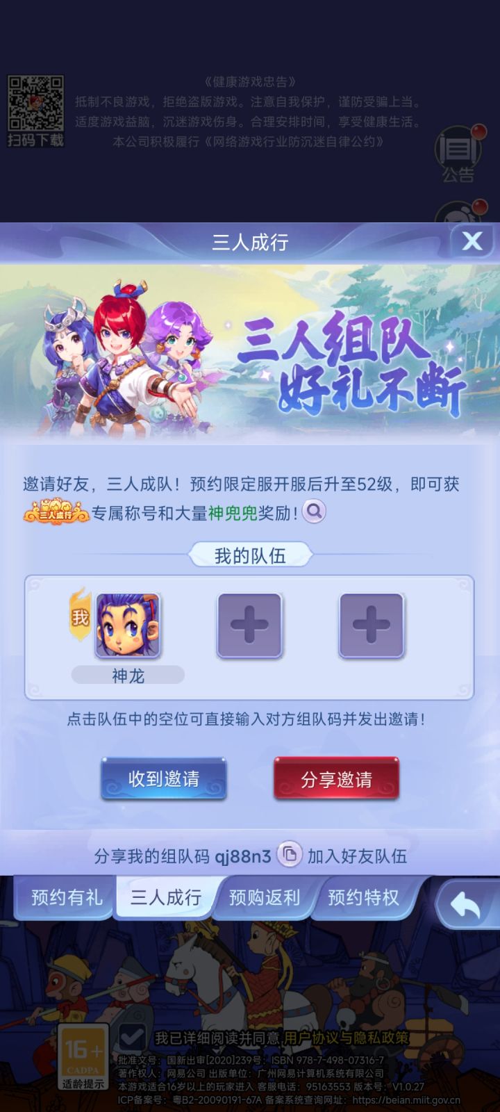 我正在参加《梦幻西游网页版》限定服预约的三人成行活动,快用组队码邀请我进队吧!我的组队码是:qj88n3