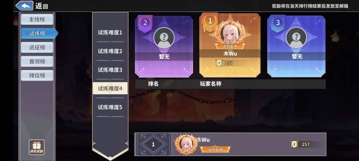 上周我是试炼4榜一,全服就我一个人试炼4通关,今晚0点结算后,直接降级到试炼3