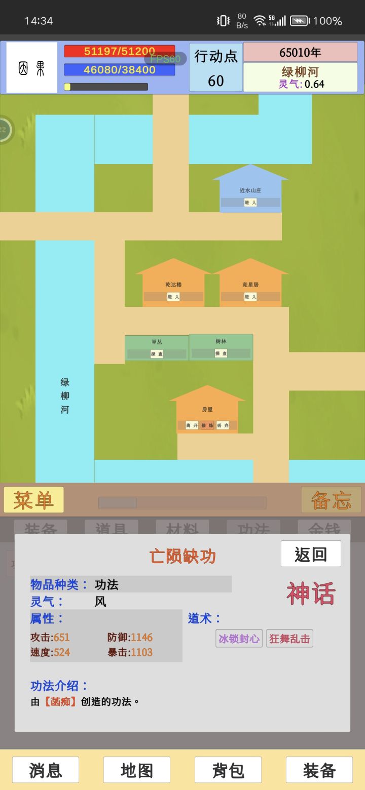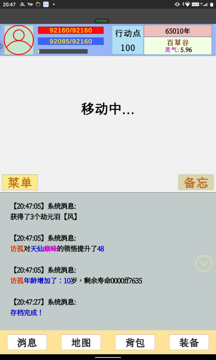 核心内容是修仙养成的那套东西,战斗完全自动,当然也支持手动,只是感觉没啥意义,毕竟功能不完整打着很费劲。地图似乎也有bug,不清楚如何去其他地方。