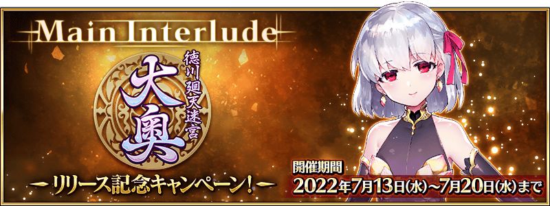 主线物语追加「德川回天迷宫 大奥」,达成条件后可在金方块商店免费开放,开放条件:通关2.3,通关ccc终幕。 通关2.3后,帕尔瓦蒂的体验关卡可免费开放。 新增山鲁佐德的幕间物语,在未召唤该从者的情况下限时开放山鲁佐德的幕间物语。 卡池: